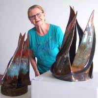 “Hanka Wolterstorff has been creating and exhibiting very beautiful ceramics for 25 years now but only recently has a collection of hers been added to the Readytex Art Gallery. The statuettes, sculptures of up to a meter in height of Wolterstorff are abstract, curvaceously shaped with strong dynamics and beautiful colors. The statuettes are asymmetrical as well as harmonious. The finish is smooth and the colors are whimsically applied in different oxides such as dark iron, green copper oxide or yellow manganese. Lately also royal blue seems to be a particular favorite of hers.