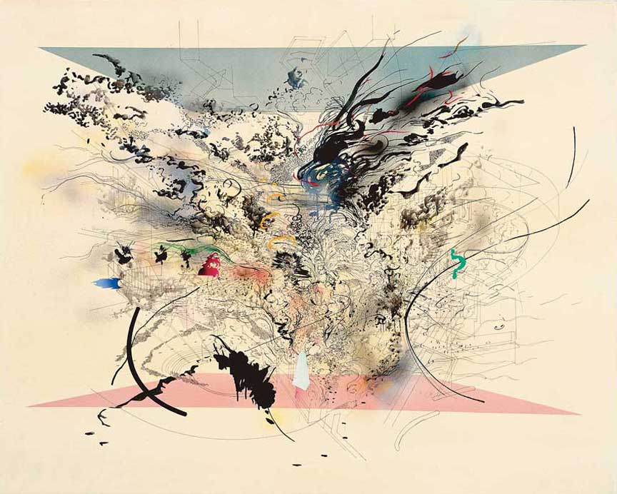 Julie Mehretu was born in 1970 in Addis Ababa, Ethiopia. She studied at University Cheik Anta Diop, Dakar (1990–91), earning a BA from Kalamazoo College, Michigan (1992), and an MFA from Rhode Island School of Design, Providence (1997). She was a resident of the CORE Program, Glassell School of Art, Museum of Fine Arts, Houston (1997-98) and the AIR Program at the Studio Museum in Harlem (2001). Mehretu’s paintings and drawings refer to elements of mapping and architecture, achieving a calligraphic complexity that resembles turbulent atmospheres and dense social networks. Architectural renderings and aerial views of urban grids enter the work as fragments, losing their real-world specificity and challenging narrow geographic and cultural readings. The paintings’ wax-like surfaces—built up over weeks and months in thin translucent layers—have a luminous warmth and spatial depth, with formal qualities of light and space made all the more complex by Mehretu’s delicate depictions of fire, explosions, and perspectives in both two and three dimensions. Her works engage the history of nonobjective art—from Constructivism to Futurism—posing contemporary questions about the relationship between utopian impulses and abstraction. Among Mehretu’s awards are the Berlin Prize (2007), from the American Academy in Berlin; a John D. and Catherine T. MacArthur Foundation Award (2005); and the American Art Award from the Whitney Museum of American Art, New York (2005). Her work has appeared in major exhibitions at the Museum of Modern Art, New York (2007); Detroit Institute of Arts (2006); Walker Art Museum, Minneapolis (2003); and Albright-Knox Art Gallery, Buffalo (2003), among others. Mehretu has participated in the Sydney Biennale (2006); Carnegie International (2004); Bienal de São Paulo (2004); Whitney Biennial (2004); and the Istanbul Biennial (2003). Julie Mehretu lives and works in Berlin.