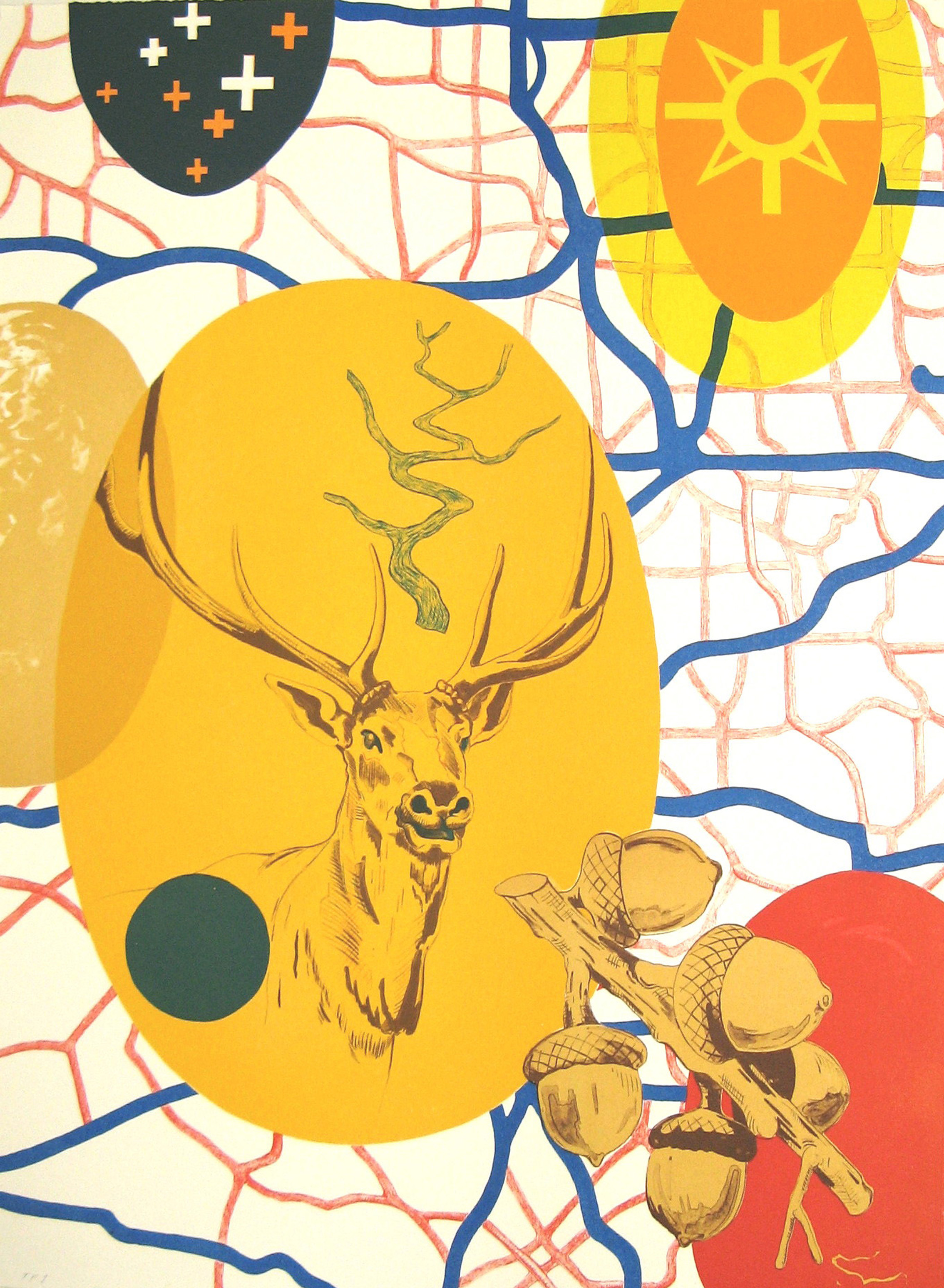 Native American artist Norman Akers creates works of art that act like maps of culture, of memory, and of place in the vaguest sense of the word. The intersecting lines that serve as the background for his images are clearly cartographic, but it is with the images placed on top of these maps that Akers creates forceful visual statements. As he puts it, “Through color, line, and visual form, I express deeply felt concerns regarding removal, disturbance, and the struggle to reclaim cultural context.” Further, he says, “Through visual narrative, I explore how my point of view relates to a historical, political, and cultural sense of place in contemporary society.”